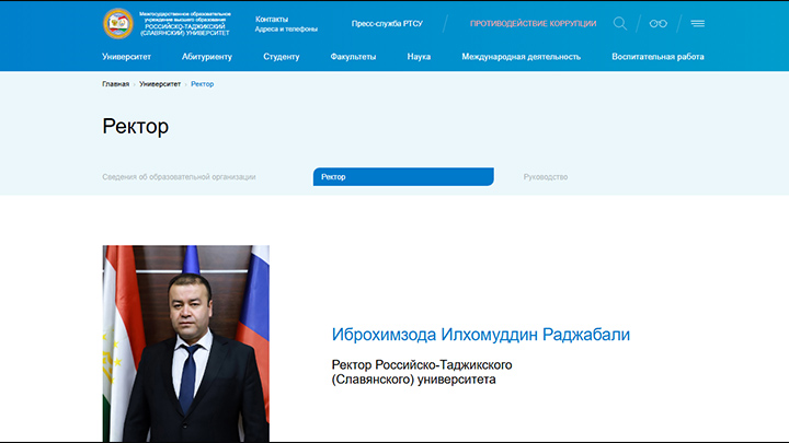 Илхомуддин Иброхимзода на сайте Славянского университета в Таджикистане по-прежнему значится ректором. Фото с сайта университета