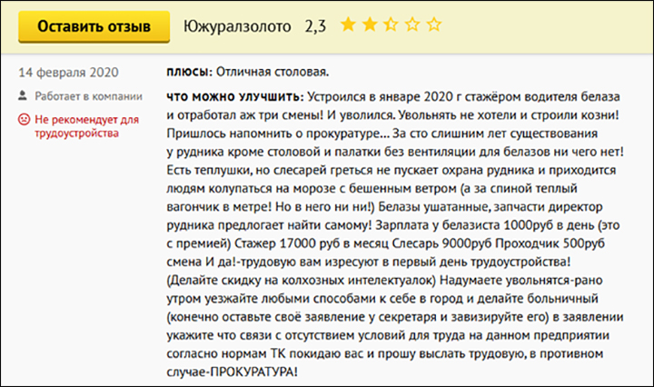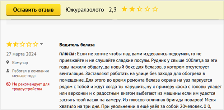 Отзыв сотрудника о работе в компании "Южуралзолото", сайт otrude.xyz, скриншот страницы