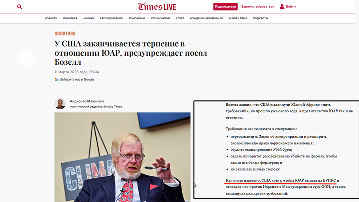 Для США сейчас самое время заняться ЮАР, где процветает коррупция, которая делает местные элиты более податливыми для западного давления. Чтобы отвлечь внимание от провальной агрессии против Ирана началом демонтажа БРИКС. О том, что "все выходят из БРИКС", Трамп повторяет с прошлого года. Но никто ведь, даже несмотря на угрозу 10%-ных пошлин, так и не вышел, значит, с кого-то пришла пора начинать.