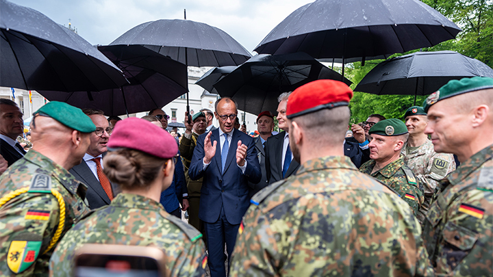 Фридрих Мерц, посещая Литву в связи с размещением там немецкой бригады, заявил: "Защищая Литву, мы защищаем Берлин". Фото: Michael Kappeler/dpa/Global Look Press