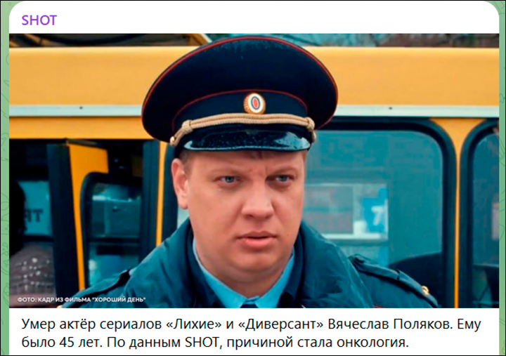 Спустя короткое время ещё одна утрата. Умер актер Вячеслав Поляков. Он скончался на 46-м году жизни. Зрители знают его по ролям в сериалах "Лихие" и "Диверсант". По предварительным данным, причиной смерти тоже стала онкология.