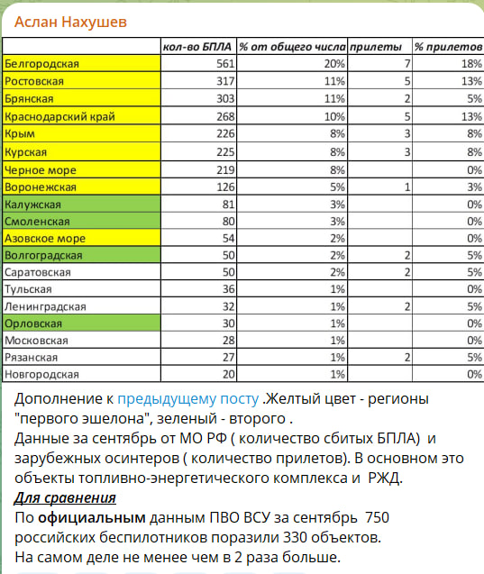 Например, из поражённых противником целей за сентябрь 65% приходится на регионы первого эшелона (из них 32% в самой страдающей Белгородской области), 5% – на регионы второго эшелона и 28% – в глубине России, но только там, где объектовая ПВО отсутствует. Например, вероятность по чему-то попасть в Москве, Питере, Ижевске, Свердловске или Татарстане практически равна нулю. Поэтому туда противник в последние месяцы совсем не стреляет. Если что, подавляющее количество НПЗ и других топливно-энергетических объектов находятся вне каких-либо зон ПВО (если они не внутри объектовых ПВО), за исключением АЭС – их специально защищают, но по ним и так не наносят ударов.