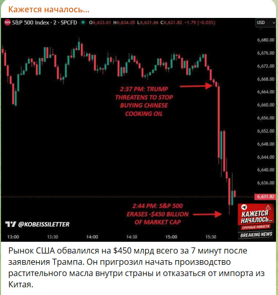 Дональд Трамп за одно утро успел сообщить о том, что Индия отказалась от русской нефти, и о готовности ввести 500-процентные пошлины для товаров из Китая (при условии присоединения к ним Евросоюза), а прибыль направить на вооружение Украины. К слову, его предыдущий выпад в сторону Пекина пару дней назад из-за того, что Китай сам выращивает сою, а не покупает её у США (чтобы специально создать трудности американским фермерам таким "экономически враждебным актом"), обвалил американский рынок на $450 млрд всего за 7 минут.