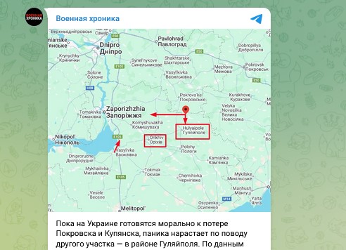 После потери Сладкого (отмечено на карте красной "булавкой") перед "Востоком" открывается перспектива как навалиться на Гуляйполе, так и пройти западнее. Если цепочка действий "Восточных" в итоге приведёт к рассекающему удару в сторону Запорожья, то крупный участок фронта в районе Гуляйполе/Орехов рискует оказаться без снабжения и в огневом мешке, что фактически будет равно повторению "покровской мясорубки". А в том случае, если пойдёт активное продвижение со стороны Васильевки, то наступление этих событий,