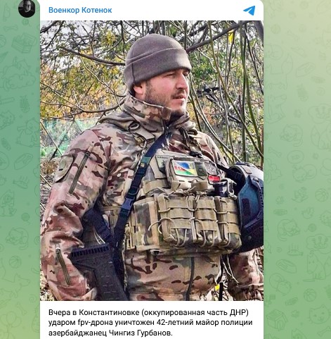 Также на Константиновском направлении активно работают русские дроны. Во время одной из дроновых атак в населённом пункте ударом fpv-дрона ликвидирован 42-летний майор полиции азербайджанец Чингиз Гурбанов.