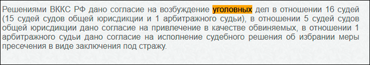 За шесть лет — с 2017 по 2022 год — квалифколлегии дали 104 согласия на возбуждение уголовных дел в отношении действующих и бывших судей, причём в 21 случае судья был в качестве обвиняемого. Об этом рассказал на десятом Всероссийском съезде судей председатель ВККС Николай Тимошин. Около 70% таких представлений касались коррупционных преступлений. Почти половина запросов на уголовное преследование относилась к действующим судьям.