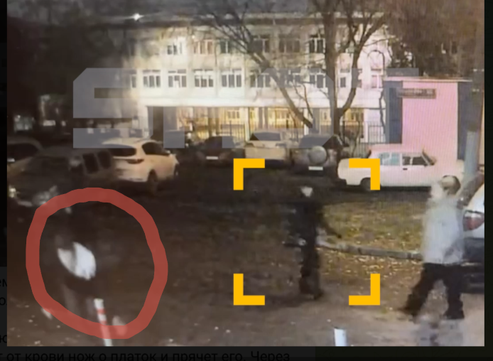 Сергей падает после удара ножом (обведён маркером). Убийца в это время уходит с места преступления. Скриншот: Телеграм-канал Shot