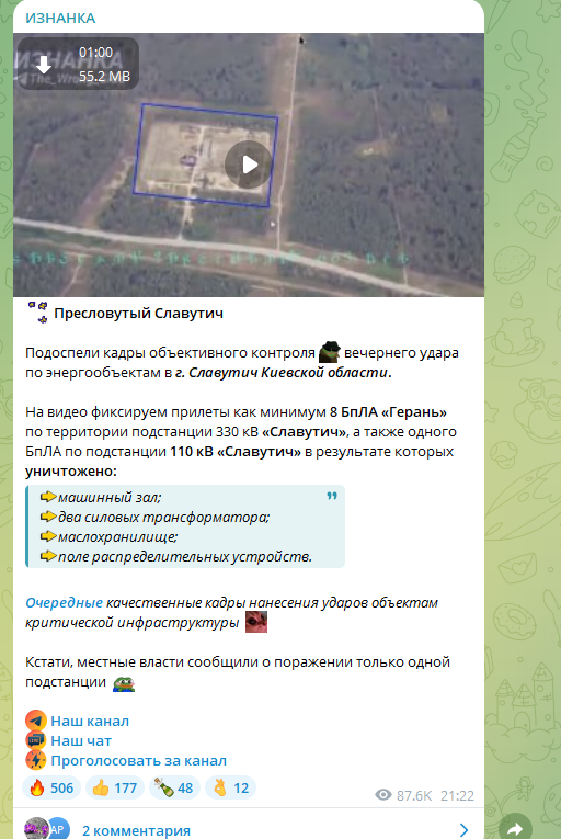 На видео фиксируем прилеты как минимум 8 БПЛА "Герань" по территории подстанции 330 кВ "Славутич", а также одного БПЛА по подстанции 110 кВ "Славутич", в результате которых уничтожено: машинный зал; два силовых трансформатора; маслохранилище; поле распределительных устройств,