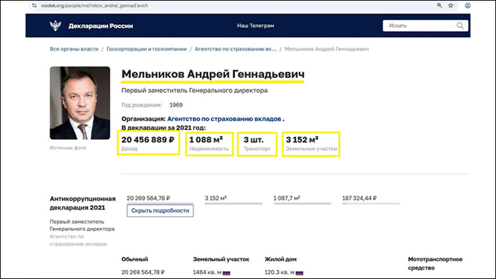 Официальные данные о доходах Мельникова, тогда ещё заместителя гендиректора, за 2021 год. Скриншот: интернет-сайт rosdek.org