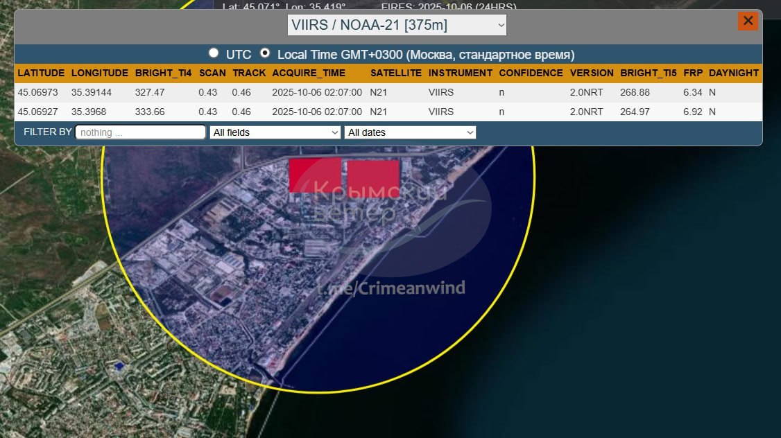 Со ссылкой на данные спутниковой съемки утверждается, что на нефтеналивном терминале два мощных очага пожара.