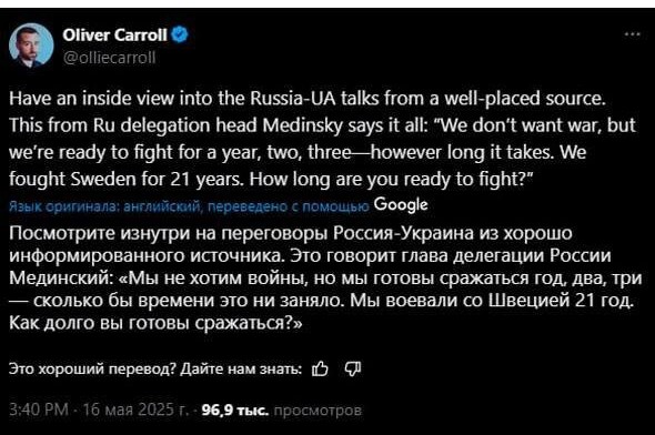 Западные журналисты убеждены, что настрой Москвы прежний и его отражает инцидент в Стамбуле в мае 2025 года. Тогда Мединский объяснял ситуацию так: