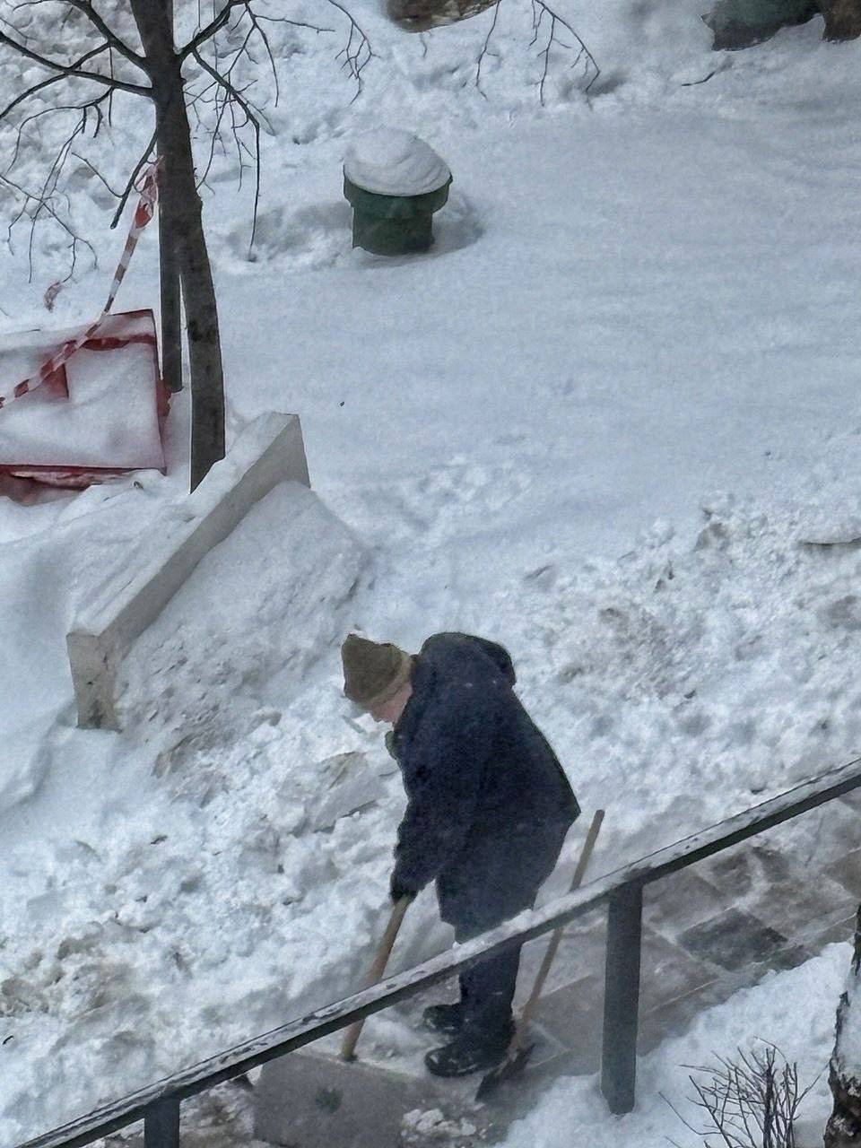 Юрий Норштейн чистит дорожки от снега рядом с подъездом. Фото: Телеграм-канал Подъем